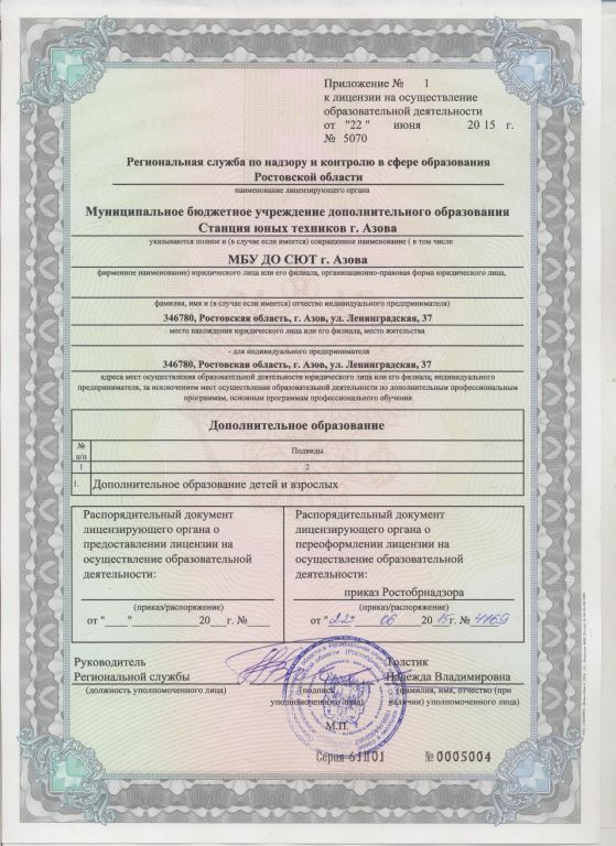 - Места осуществления образовательной деятельности по дополнительным образовательным программам: г.Азов, ул.Ленинградская,37